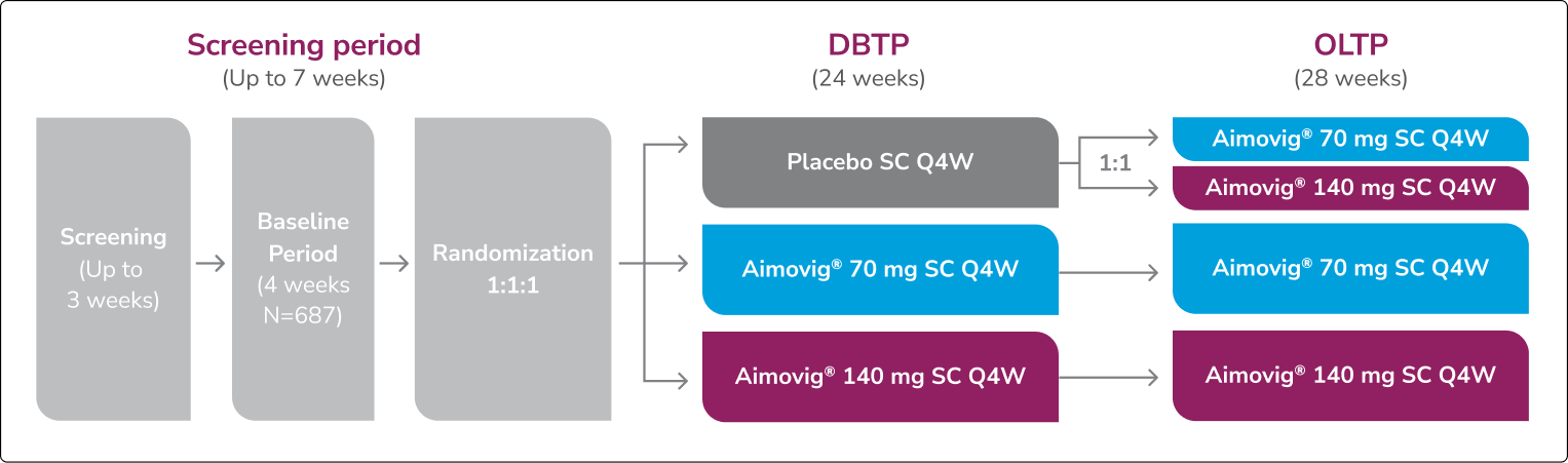 Aimovig® was evaluated for the prevention of episodic migraine in patients aged 18 to 65 years with 4 to 14 monthly migraine days (MMDs) in this multicenter, 24-week study.1